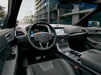 It's powered by a 2.7L V6 EcoBoost engine that delivers projected 335 horsepower and 380 lb.-ft. Of torque coupled with a finely tuned eight-speed transmission. The 2019 Edge ST has road-gripping all-wheel drive, a sport-tuned suspension and race-inspired paddle shifters. Its standard leather-trimmed seats include supportive bolsters that help anchor you in tight turns. Topping it off is a striking new grille with gloss black-painted mesh and prominent ST logo.