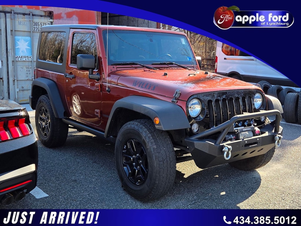 Connectivity Group (Remote USB Port, Tire Pressure Monitoring Display, Uconnect Voice Command w/Bluetooth, and Vehicle Information Center), Quick Order Package 24W Willy's Wheeler (1-Year SIRIUSXM Radio Service, 4-Wheel Drive Swing Gate Decal, Air Conditioning, Anti-Spin Differential Rear Axle, Deep Tint Sunscreen Windows, Low Gloss Black Wrangler Decal, MOPAR Jeep Trail Rated Kit, MOPAR Slush Mats, Rear Passenger Assist Handles Kit, Rock Rails, SIRIUS Satellite Radio, Wheels: 17" x 7.5" High Gloss Black Willys, and Willys Hood Decal), Trailer Tow Group (Trailer Tow w/4-Pin Connector Wiring), Willys Wheeler Package, 16" x 7.0" Luxury Styled Steel Wheels, 4-Wheel Disc Brakes, 6 Speakers, ABS brakes, AM/FM radio, Black 3-Piece Hard Top, Brake assist, CD player, CLIMATE CONTROL, Cloth Bucket Seats, Compass, CRUISE CONTROL, Delete Sunrider Soft Top, Driver door bin, Driver vanity mirror, Dual front impact airbags, Electronic Stability Control, Freedom Panel Storage Bag, FRESH VA STATE INSPECTION, Front anti-roll bar, Front Bucket Seats, Front Center Armrest w/Storage, Front fog lights, Integrated roll-over protection, Low tire pressure warning, MANUAL TRANSMISSION, Normal Duty Suspension, Occupant sensing airbag, Outside temperature display, Passenger door bin, Passenger vanity mirror, Performance Suspension (DISC), Power steering, Radio: Uconnect 130 AM/FM/CD/MP3, Rear anti-roll bar, Rear Window Defroster, Rear Window Wiper/Washer, Speed control, Steering wheel mounted audio controls, Sunrider Soft Top, Tachometer, Tilt steering wheel, Tinted Rear Quarter & Liftgate Windows, Traction control, Trip computer, and Variably intermittent wipers.